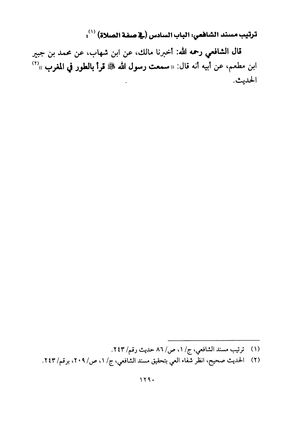 قال الشَّافِعِي رحمه الله: أخبرنا مالك، عن ابن شهاب، عن محمد بن جبير