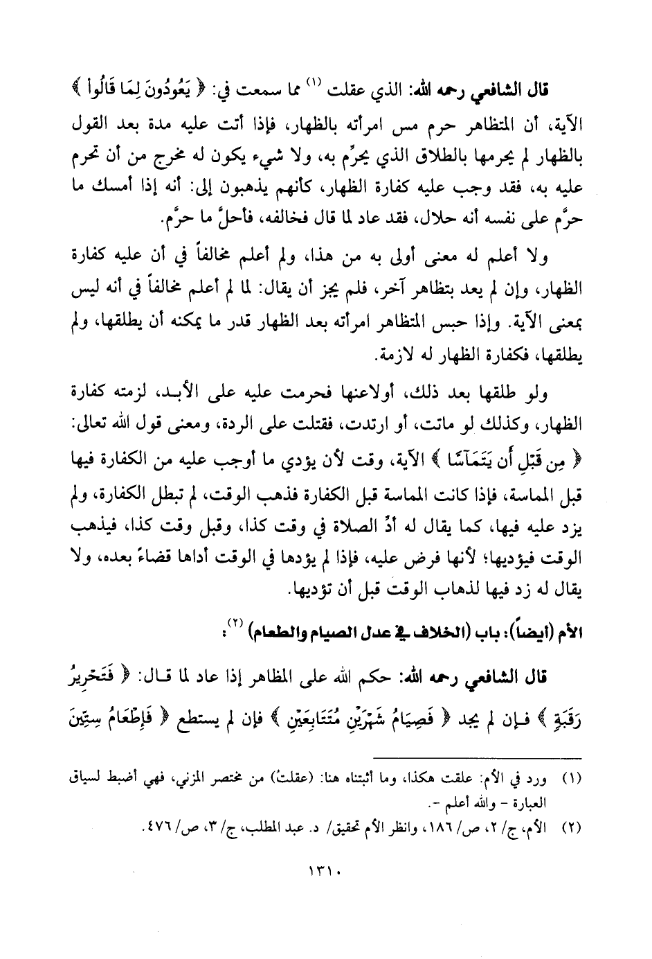 قال الشَّافِعِي رحمه الله: حكم اللَّه على المظاهر إذا عاد لما قال: