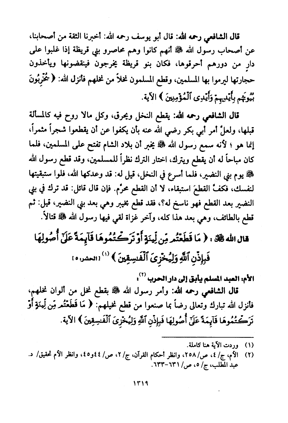 قال الشَّافِعِي رحمه الله: وأمر رسول الله - صلى الله عليه وسلم - بقطع نخل من ألوان نخلهم، فأنزل اللَّه تبارك وتعالى رضاً بما صنعوا من قطع نخيلهم: (مَا قَطَعْتُمْ مِنْ لِينَةٍ أَوْ تَرَكْتُمُوهَا قَائِمَةً عَلَى أُصُولِهَا فَبِإِذْنِ اللَّهِ وَلِيُخْزِيَ الْفَاسِقِينَ) .