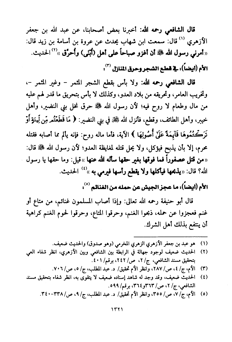 وتخريب العامر، وتحريفه من بلاد العدو، وكذلك لا بأس بتحريق ما قدر لهم عليه من مال وطعام لا روح فيه؛ لأن رسول الله - صلى الله عليه وسلم - حرق نخل بني النضير، وأهل خيبر، وأهل الطائف، وقطع، فأنزل الله - عزَّ وجلَّ - في بني النضير: (مَا قَطَعْتُمْ مِنْ لِينَةٍ أَوْ تَرَكْتُمُوهَا قَائِمَةً عَلَى أُصُولِهَا) فأما ماله روح: فإنه يالم مما أصابه فقتله محرم، إلا بأن يذبح فيؤكل، ولا يحل قتله لمغايظة العدو؛ لأن رسول الله - صلى الله عليه وسلم - قال: