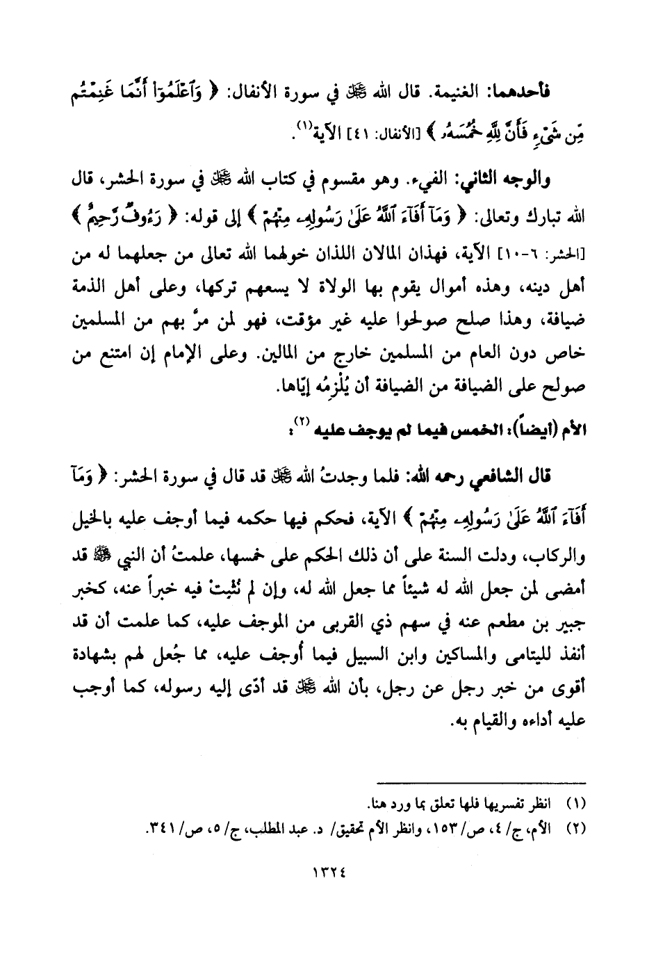 قال الشَّافِعِي رحمه الله: فلما وجدتُ الله - عزَّ وجلَّ قد قال في سورة الحشر: (وَمَا أَفَاءَ اللَّهُ عَلَى رَسُولِهِ مِنْهُمْ) الآية.