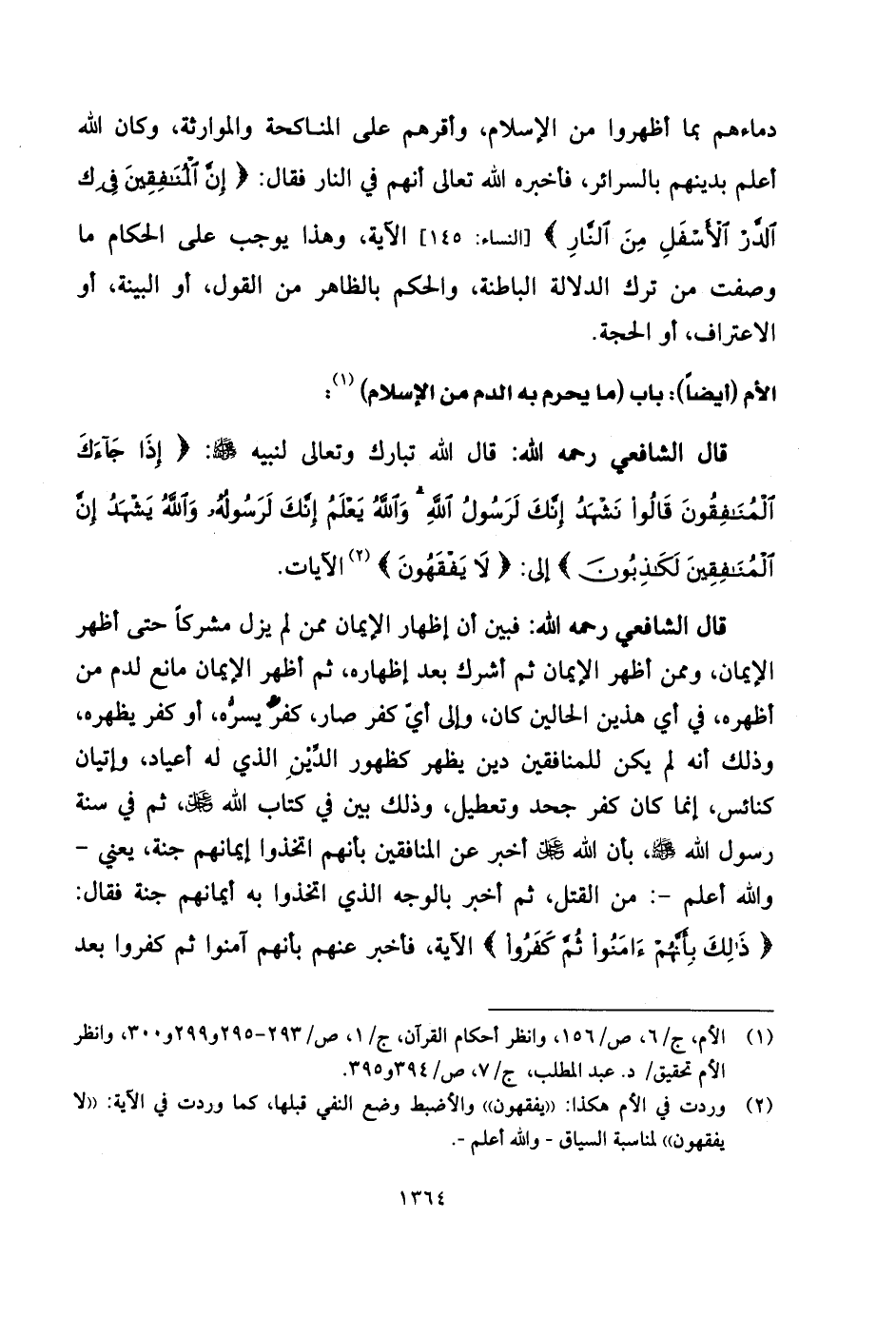 قال الشَّافِعِي رحمه الله: قال الله تبارك وتعالى لنبيه - صلى الله عليه وسلم -: (إِذَا جَاءَكَ الْمُنَافِقُونَ قَالُوا نَشْهَدُ إِنَّكَ لَرَسُولُ اللَّهِ وَاللَّهُ يَعْلَمُ إِنَّكَ لَرَسُولُهُ وَاللَّهُ يَشْهَدُ إِنَّ الْمُنَافِقِينَ لَكَاذِبُونَ (1) اتَّخَذُوا أَيْمَانَهُمْ جُنَّةً فَصَدُّوا عَنْ سَبِيلِ اللَّهِ إِنَّهُمْ سَاءَ مَا كَانُوا يَعْمَلُونَ (2) ذَلِكَ بِأَنَّهُمْ آمَنُوا ثُمَّ كَفَرُوا فَطُبِعَ عَلَى قُلُوبِهِمْ فَهُمْ لَا يَفْقَهُونَ (3) .
