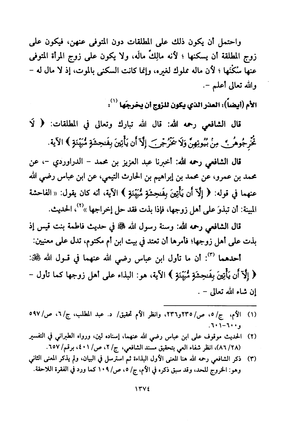 (لَا تُخْرِجُوهُنَّ مِنْ بُيُوتِهِنَّ وَلَا يَخْرُجْنَ إِلَّا أَنْ يَأْتِينَ بِفَاحِشَةٍ مُبَيِّنَةٍ) الآية.