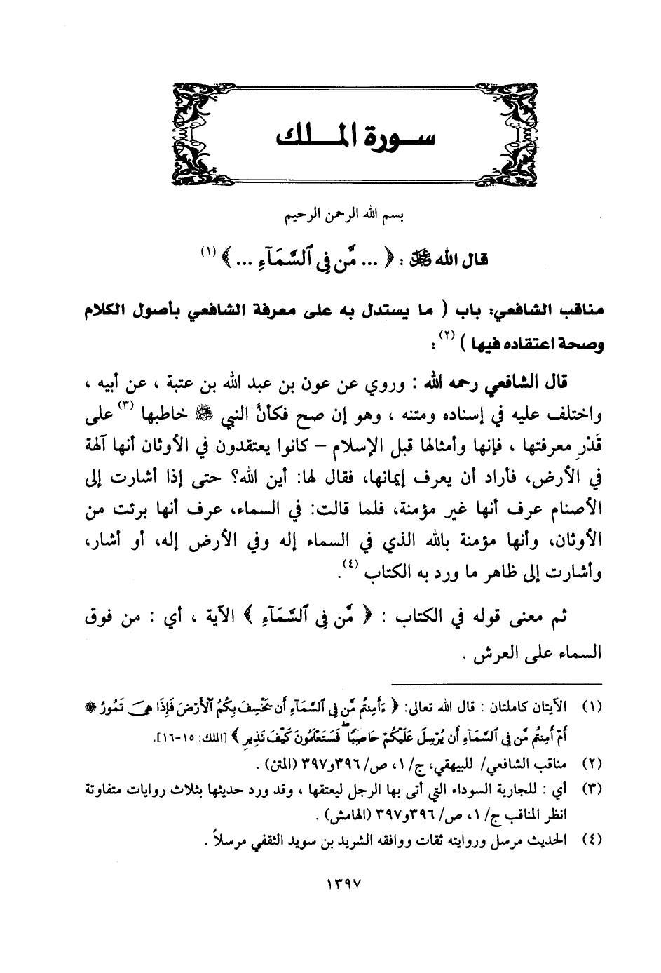 واختلف عليه في إسناده ومتنه، وهو إن صح فكان النبي - صلى الله عليه وسلم - خاطبها على قَدرِ معرفتها، فإنها وأمثالها قبل الإسلام - كانوا يعتقدون في الأوثان أنها آلهة في الأرض، فأراد أن يعرف إيمانها، فقال لها: أين اللَّه؟ حتى إذا أشارت إلى الأصنام عرف أنها غير مؤمنة، فلما قالت: في السماء، عرف أنها برئت من الأوثان، وأنها مؤمنة بالله الذي في السماء إله وفي الأرض إله، أو أشار، وأشارت إلى ظاهر ما ورد به الكتاب.
