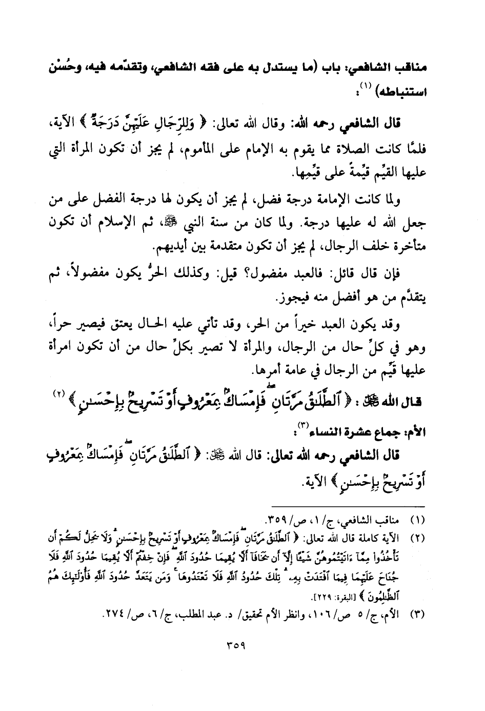 قال الشَّافِعِي رحمه الله تعالى: قال اللَّه - عز وجل -: (الطَّلَاقُ مَرَّتَانِ فَإِمْسَاكٌ بِمَعْرُوفٍ أَوْ تَسْرِيحٌ بِإِحْسَانٍ) الآية.