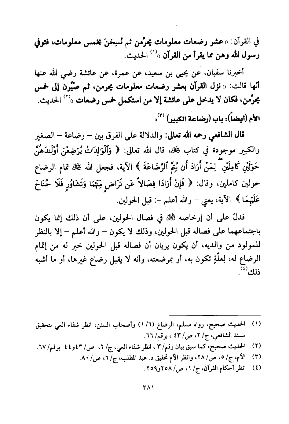 والكبير موجودة في كتاب الله، قال الله تعالى: (وَالْوَالِدَاتُ يُرْضِعْنَ أَوْلَادَهُنَّ حَوْلَيْنِ كَامِلَيْنِ لِمَنْ أَرَادَ أَنْ يُتِمَّ الرَّضَاعَةَ) الآية، فجعل اللَّه - عز وجل - تمام الرضاع حولين كاملين، وقال: (فَإِنْ أَرَادَا فِصَالًا عَنْ تَرَاضٍ مِنْهُمَا وَتَشَاوُرٍ فَلَا جُنَاحَ عَلَيْهِمَ) الآية، يعني - والله أعلم -: قبل الحولين.