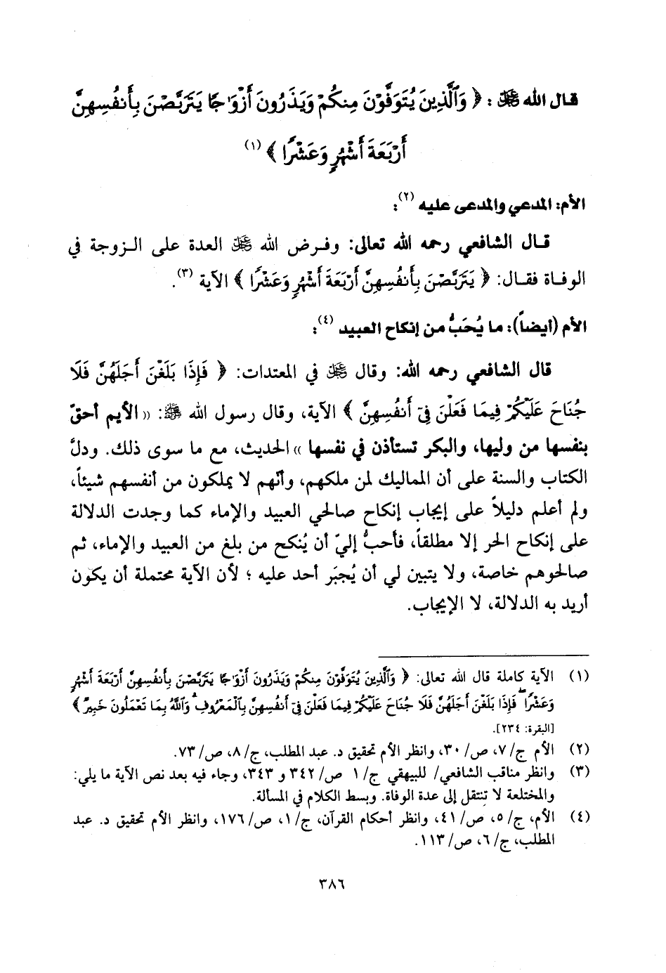 قال الشَّافِعِي رحمه الله: وقال - عز وجل - في المعتدات: (فَإِذَا بَلَغْنَ أَجَلَهُنَّ فَلَا جُنَاحَ عَلَيْكُمْ فِيمَا فَعَلْنَ فِي أَنْفُسِهِنَّ) الآية، وقال رسول الله - صلى الله عليه وسلم -: "الأيم أحق بنفسها من وليها، والبكر تستأذن في نفسها" الحديث، مع ما سوى ذلك. ودلَّ الكتاب والسنة على أن المماليك لمن ملكهم، وأنههم لا يملكون من أنفسهم شيئاً.