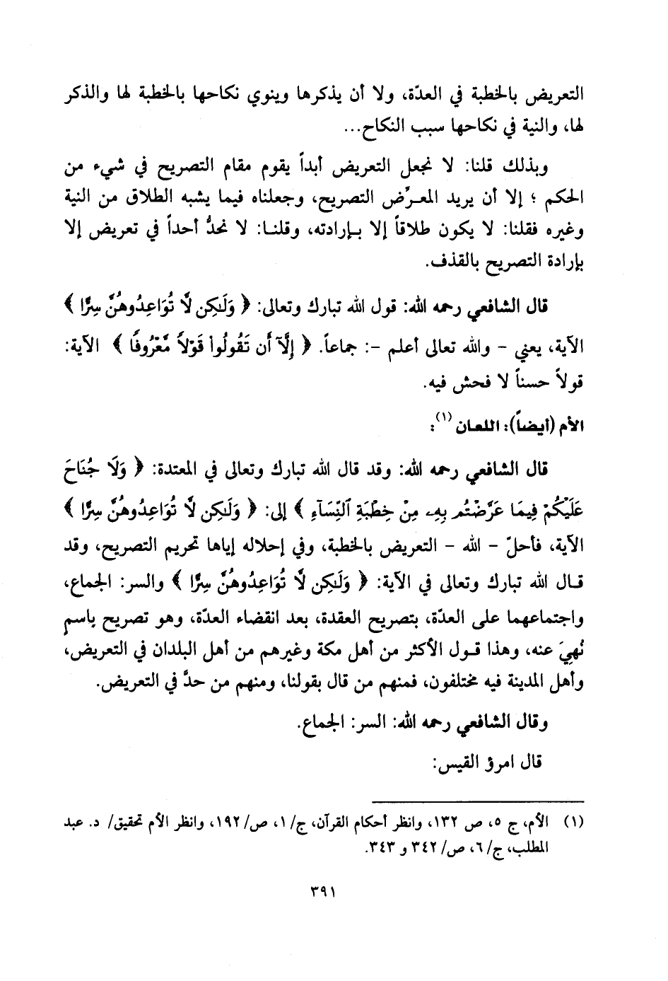 قال الشَّافِعِي رحمه الله: وقد قال الله تبارك وتعالى في المعتدة: (وَلَا جُنَاحَ عَلَيْكُمْ فِيمَا عَرَّضْتُمْ بِهِ مِنْ خِطْبَةِ النِّسَاءِ) إلى: (وَلَكِنْ لَا تُوَاعِدُوهُنَّ سِرًّا)