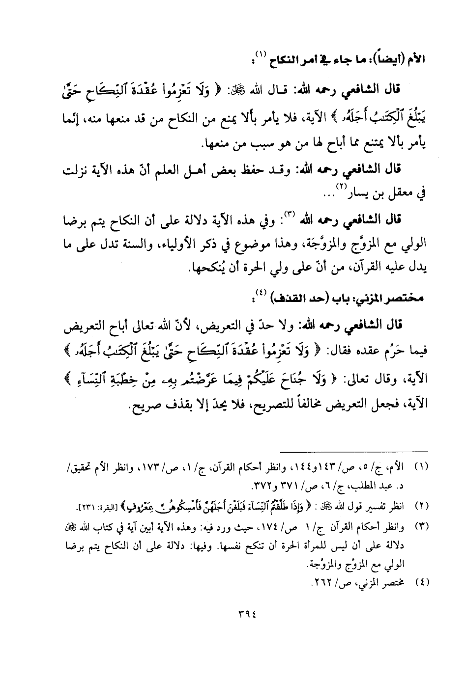 قال الشَّافِعِي رحمه الله: قال اللَّه - عز وجل -: (وَلَا تَعْزِمُوا عُقْدَةَ النِّكَاحِ حَتَّى يَبْلُغَ الْكِتَابُ أَجَلَهُ) الآية، فلا يأمر بألَّا يمنع من النكاح من قد منعها منه، إنما يأمر بألَّا يمتنع مما أباح لها من هو سبب من منعها.