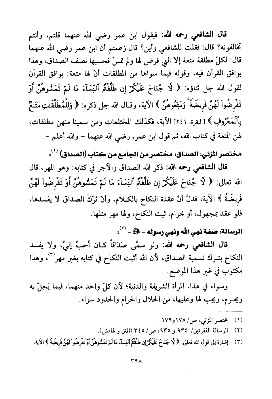 تخالفونه؟ قال: فقلت للشافعي وأين؛ قال زعمتم أن ابن عمر رضي اللَّه عنهما قال: لكلّ مطلقة متعة إلا التي فرض لها ولم تمس فحسبها نصف الصداق.