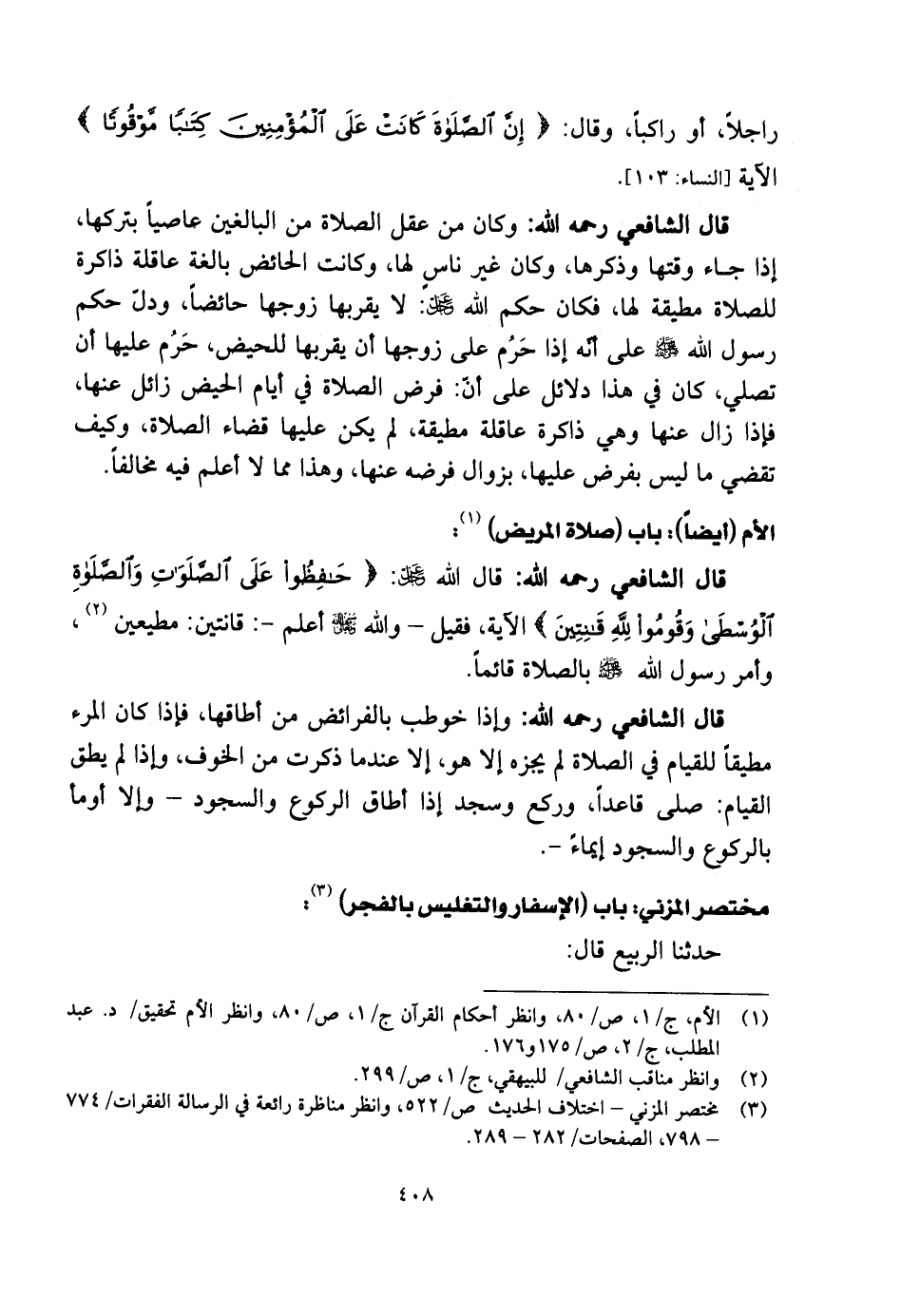 قال الشَّافِعِي رحمه الله: قال اللَّه - عز وجل -: (حَافِظُوا عَلَى الصَّلَوَاتِ وَالصَّلَاةِ الْوُسْطَى وَقُومُوا لِلَّهِ قَانِتِينَ) الآية.
