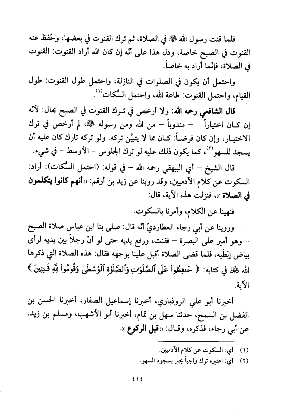 فلما قنت رسول الله - صلى الله عليه وسلم - في الصلاة، ثم ترك القنوت في بعضها، وحفظ عنه القنوت في الصبح خاصة، ودل هذا على أنَّه إن كان اللَّه أراد القنوت: القنوت في الصلاة، فإنَّما أراد به خاصاً.