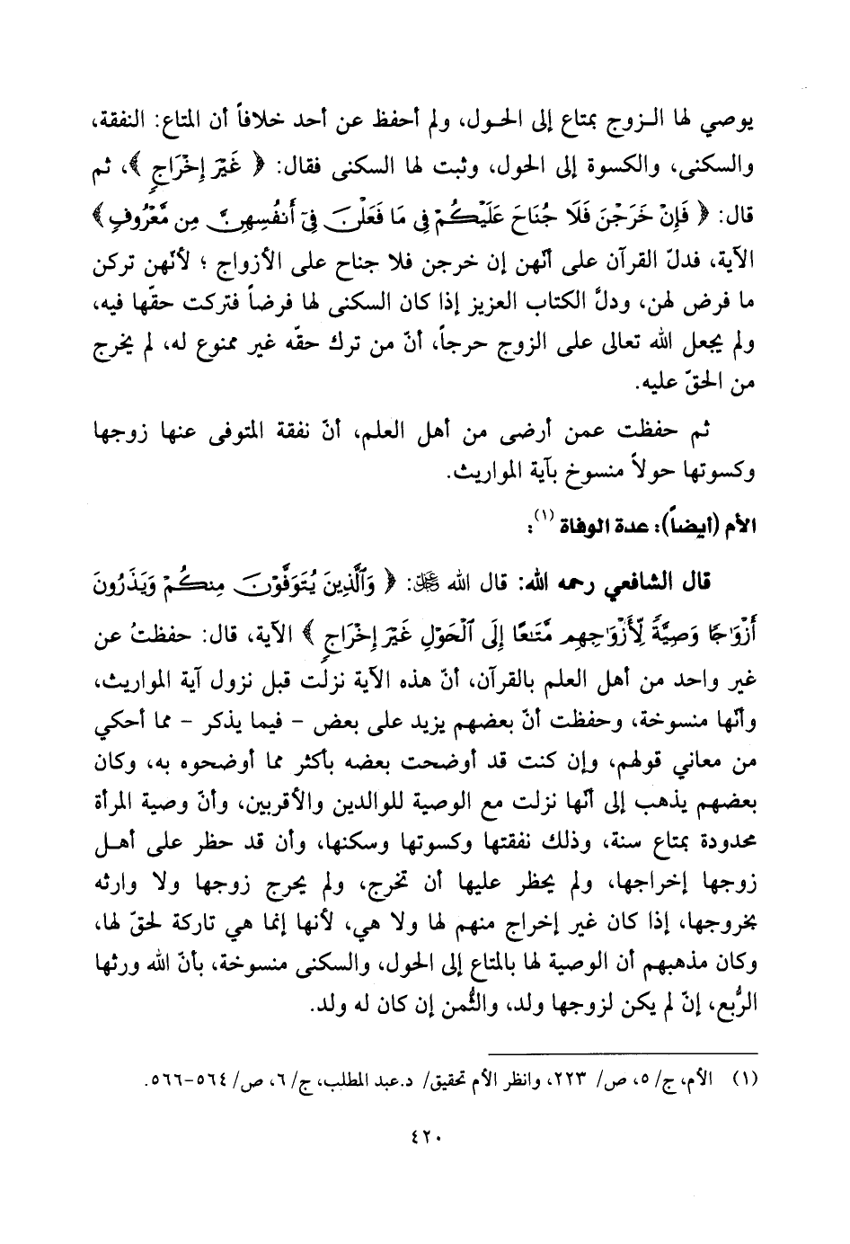قال الشَّافِعِي رحمه الله: قال اللَّه - عز وجل -: (وَالَّذِينَ يُتَوَفَّوْنَ مِنْكُمْ وَيَذَرُونَ أَزْوَاجًا وَصِيَّةً لِأَزْوَاجِهِمْ مَتَاعًا إِلَى الْحَوْلِ غَيْرَ إِخْرَاجٍ) الآية، قال: حفظتُ عن غير واحد من أهل العلم بالقرآن، أن هذه الآية نزلت قبل نزول آية المواريث، وأنها منسوخة، وحفظت أنَّ بعضهم يزيد على بعض - فيما يذكر - مما أحكي من معاني قولهم، وإن كنت قد أوضحت بعضه بكثر مما أوضحوه به، وكان بعضهم يذهب إلى أنَّها نزلت مع الوصية للوالدين والأقربين، وأن وصية المرأة محدودة بمتاع سنة، وذلك نفقتها وكسوتها وسكنها، وأن قد حظر على أهل زوجها إخراجها، ولم يحظر عليها أن تخرج، ولم يحرج زوجها ولا وارثه بخروجها، إذا كان غير إخراج منهم لها ولا هي، لأنها إنما هي تاركة لحق لها.