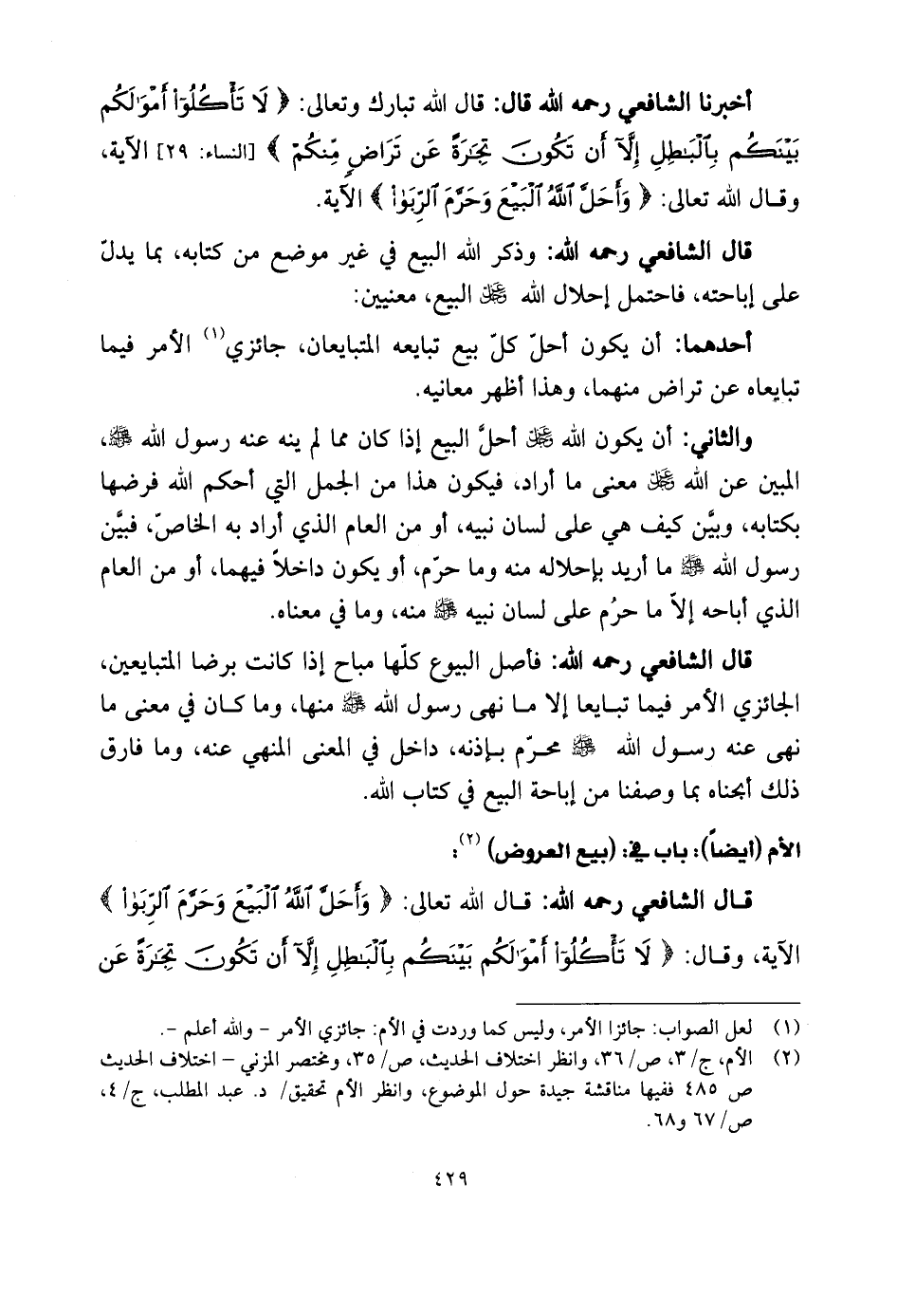أخبرنا الشَّافِعِي رحمه الله قال: قال الله تبارك وتعالى: (لَا تَأْكُلُوا أَمْوَالَكُمْ بَيْنَكُمْ بِالْبَاطِلِ إِلَّا أَنْ تَكُونَ تِجَارَةً عَنْ تَرَاضٍ مِنْكُمْ) الآية.