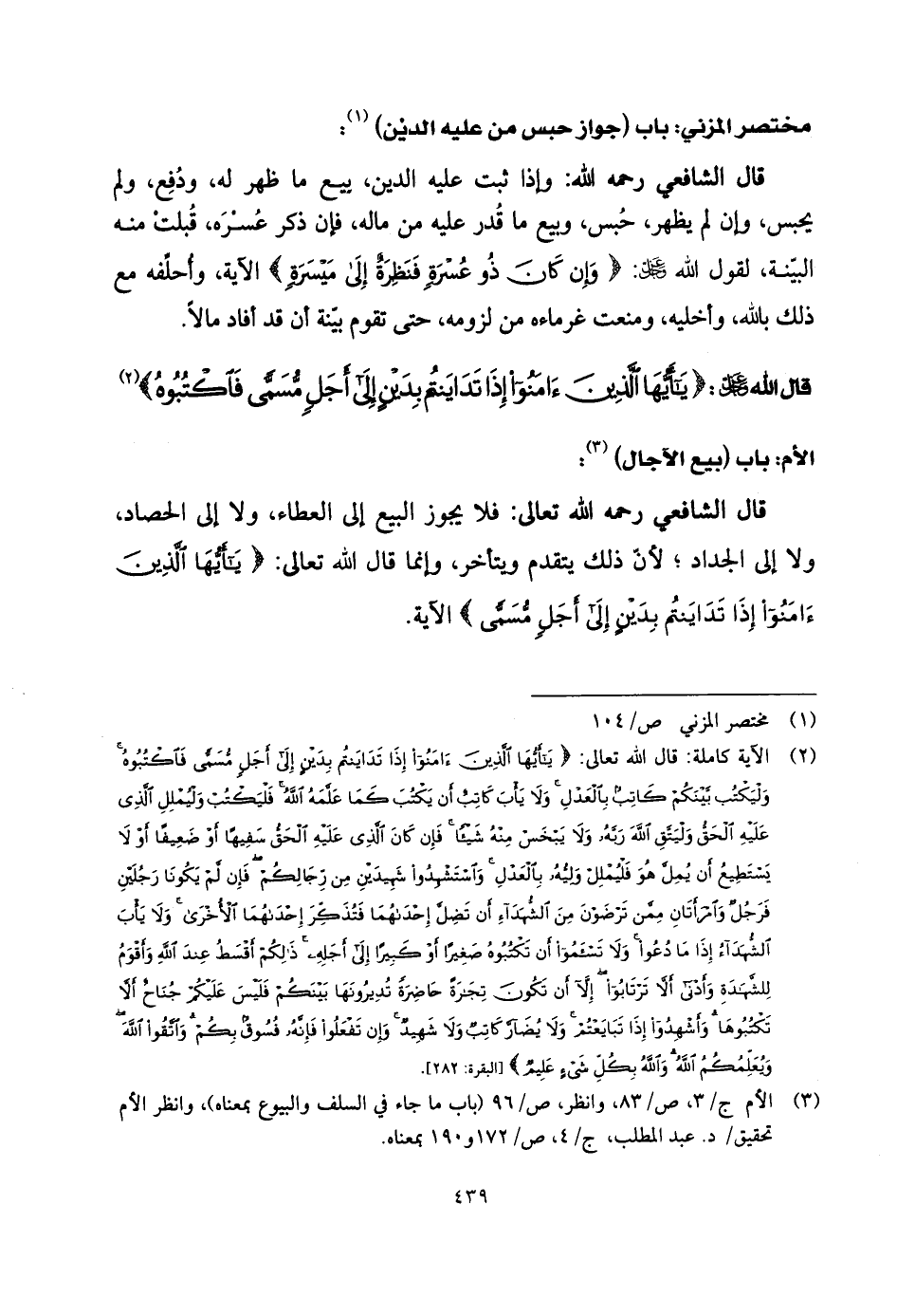 مختصر المزني: باب (جواز حبس من عليه الدين) :
