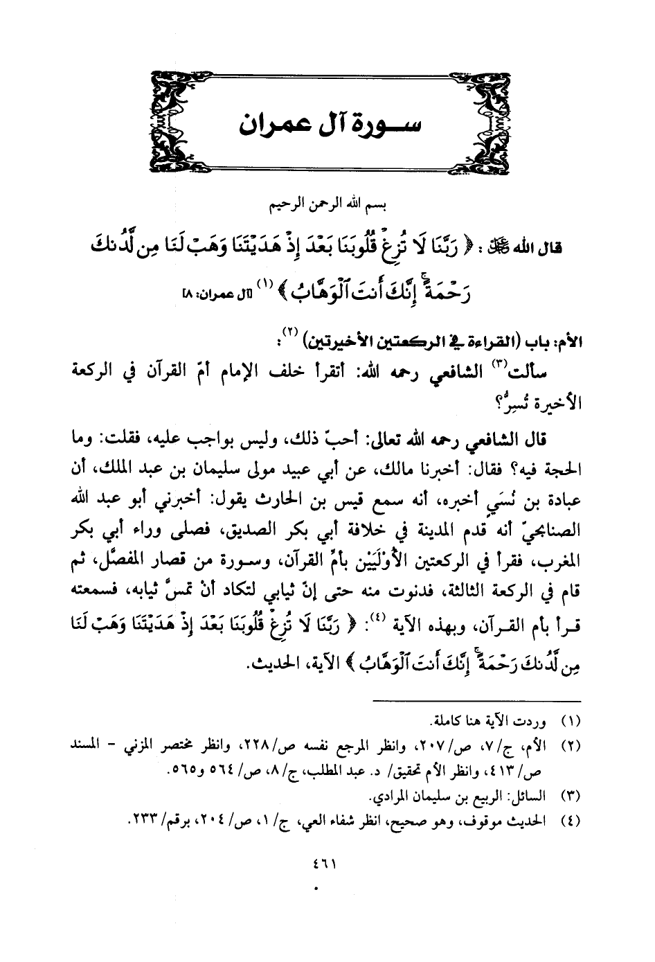 المغرب، فقرأ في الركعتين الأوْلَيَين بأم القرآن، وسورة من قصار المفضل، ثم قام في الركعة الثالثة، فدنوت منه حتى إن ثيابي لتكاد أنْ تمس ثيابه، فسمعته قرأ بأم القرآن، وبهذه الآية: (رَبَّنَا لَا تُزِغْ قُلُوبَنَا بَعْدَ إِذْ هَدَيْتَنَا وَهَبْ لَنَا مِنْ لَدُنْكَ رَحْمَةً إِنَّكَ أَنْتَ الْوَهَّابُ) الآية، الحديث.