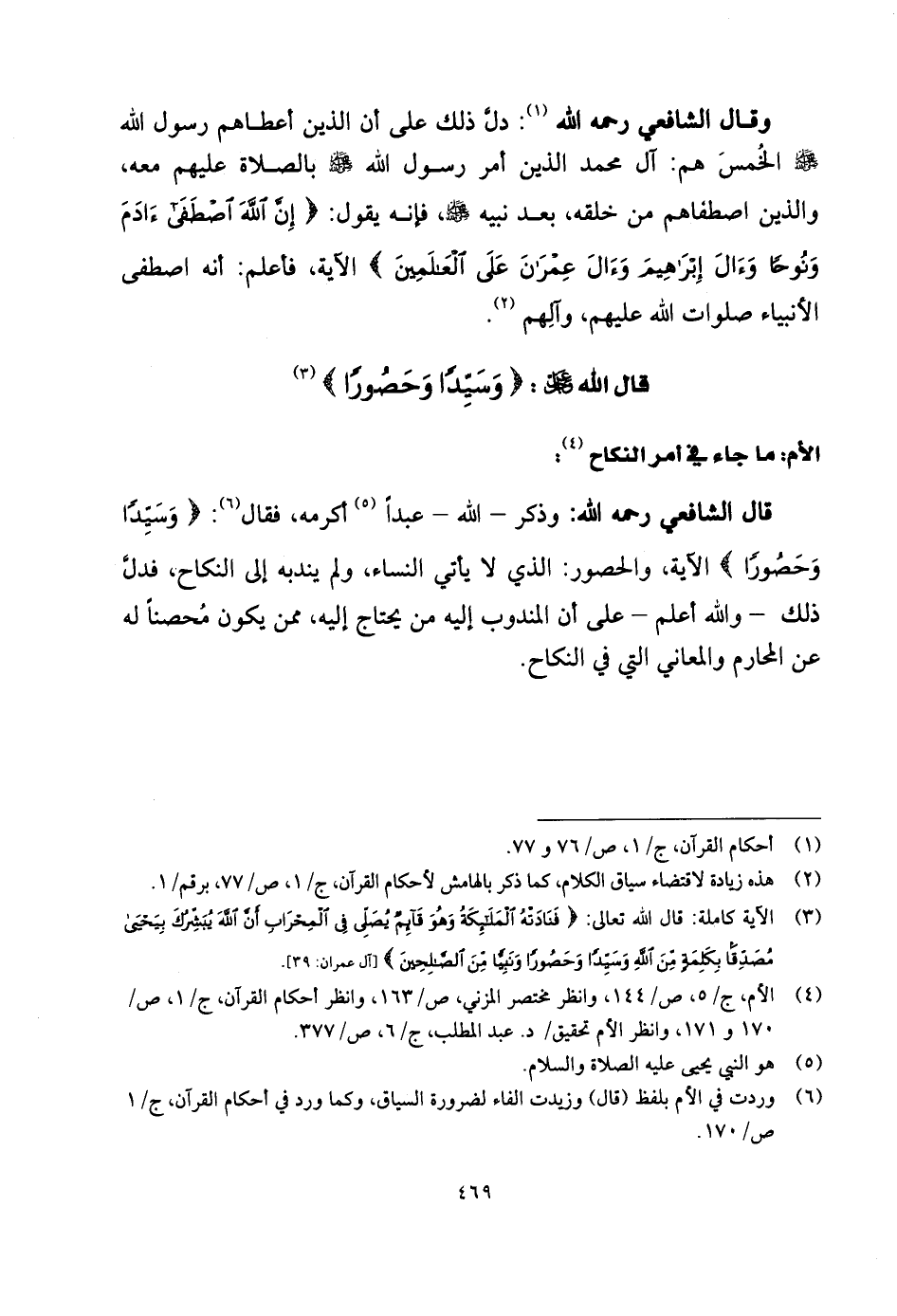 قال الشَّافِعِي رحمه الله: وذكر - اللَّه - عبداً كرمه، فقال: (وَسَيِّدًا وَحَصُورًا) الآية، والحصور: الذي لا يأتي النساء، ولم يندبه إلى النكاحْ، فدلَّ ذلك - واللَّه أعلم - على أن المندوب إليه من يحتاج إليه، ممن يكون مُحصناً له عن المحارم والمعاني التي في النكاح.