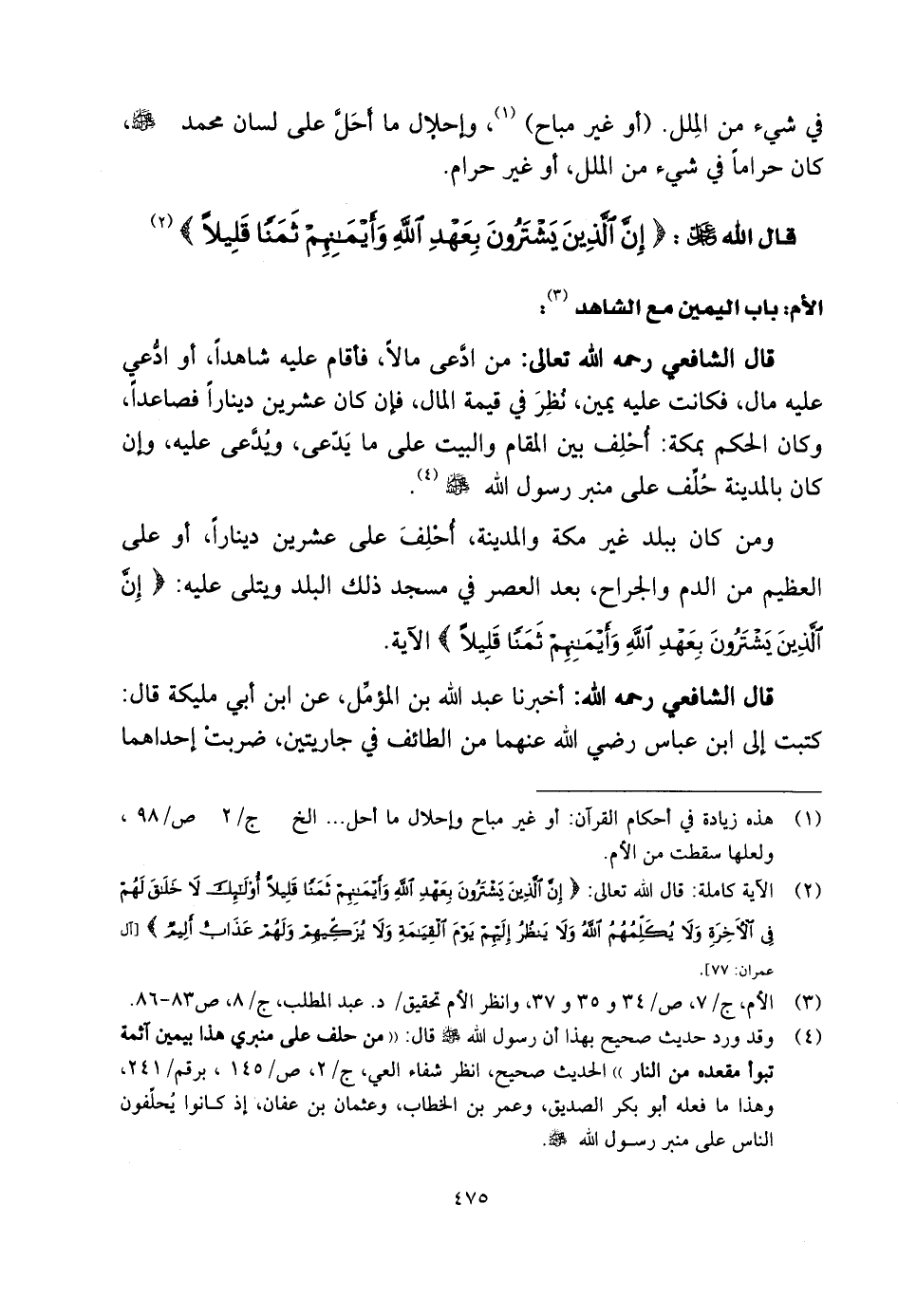 عليه مال، فكانت عليه يمين، ئظِرَ في قيمة المال، فإن كان عشرين ديناراً فصاعداً، وكان الحكم بمكة: أحْلِف بين المقام والبيت على ما يَدّعى، ويُدعى عليه، وإن كان بالمدينة حُلف على منبر رسول الله - صلى الله عليه وسلم -) .