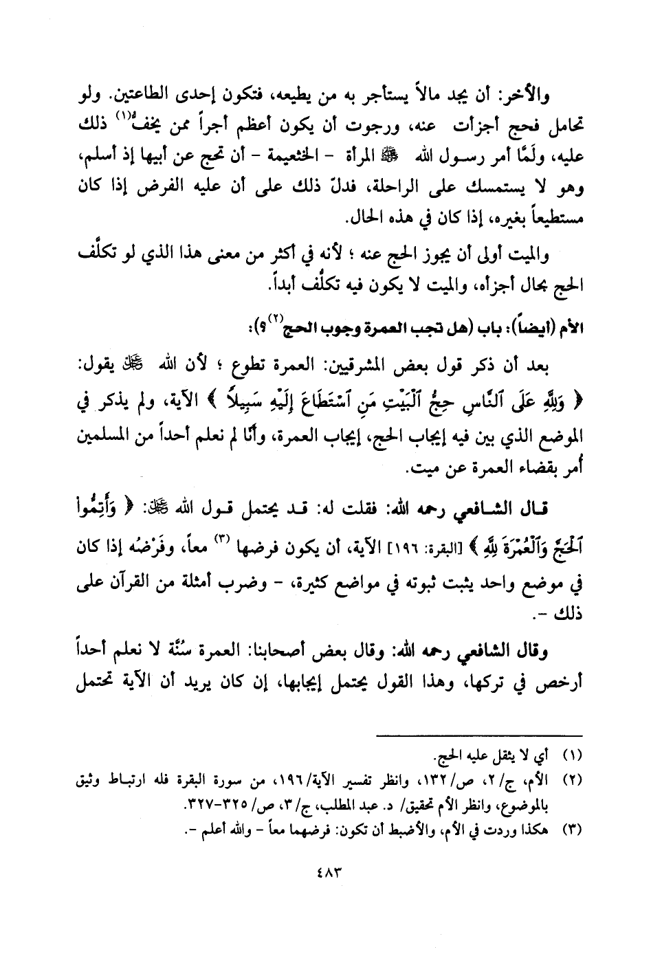 قال الشَّافِعِي رحمه الله: فقلت له: قد يحتمل قول اللَّه - عز وجل -: (وَأَتِمُّوا الْحَجَّ وَالْعُمْرَةَ لِلَّهِ) الآية.