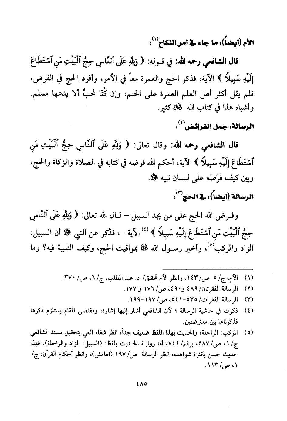 قال الشَّافِعِي رحمه الله: وقال تعالى: (وَلِلَّهِ عَلَى النَّاسِ حِجُّ الْبَيْتِ مَنِ اسْتَطَاعَ إِلَيْهِ سَبِيلًا) الآية، أحكم اللَّه فرضه في كتابه في الصلاة والزكاة والحج، وبين كيف فَرَضَه على لسان نبيه - صلى الله عليه وسلم -.