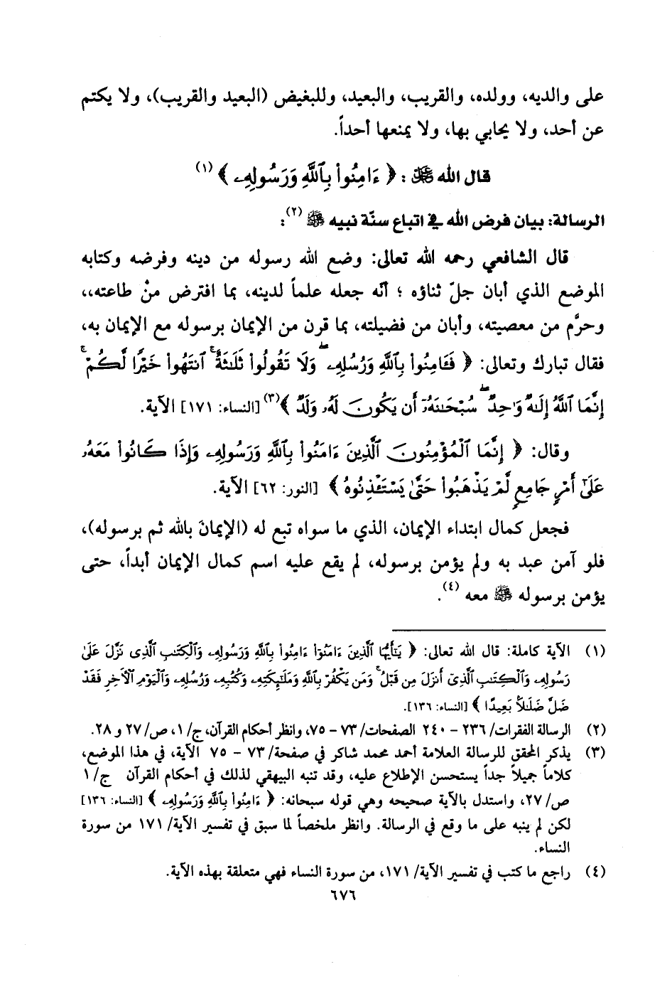 الموضع الذي أبان جل ثناؤه؛ لأنَّه جعله علماً لدينه، بما افترض من طاعته،، وحرّم من معصيته، وأبان من فضيلته، بما قرن من الإيمان برسوله مع الإيمان به، فقال تبارك وتعالى: (فَآمِنُوا بِاللَّهِ وَرُسُلِهِ وَلَا تَقُولُوا ثَلَاثَةٌ انْتَهُوا خَيْرًا لَكُمْ إِنَّمَا اللَّهُ إِلَهٌ وَاحِدٌ سُبْحَانَهُ أَنْ يَكُونَ لَهُ وَلَدٌ) الآية.