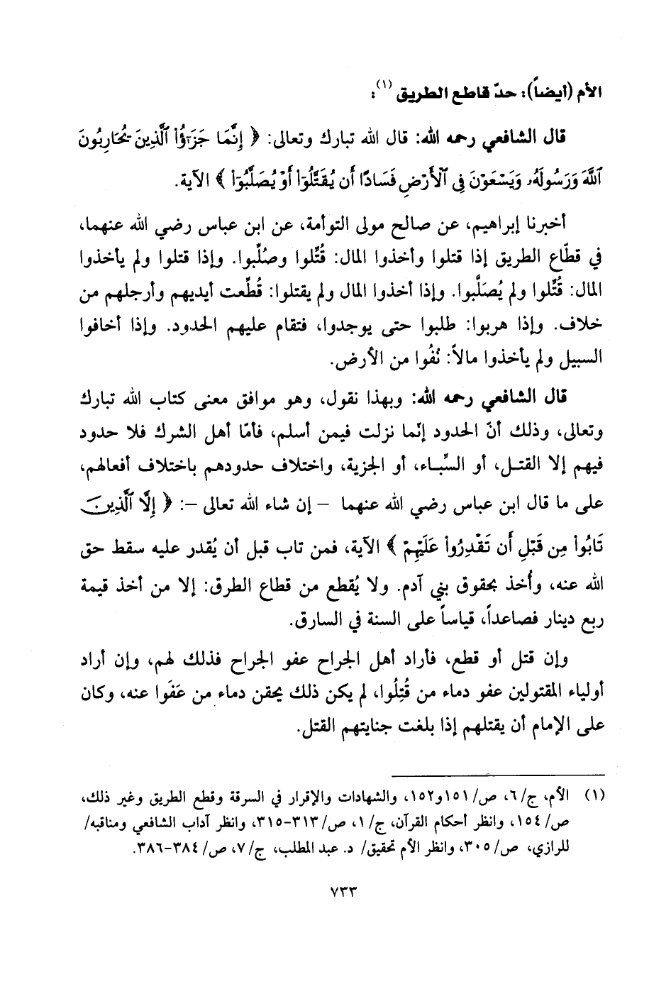 قال الشَّافِعِي رحمه الله: قال الله تبارك وتعالى: (إِنَّمَا جَزَاءُ الَّذِينَ يُحَارِبُونَ اللَّهَ وَرَسُولَهُ وَيَسْعَوْنَ فِي الْأَرْضِ فَسَادًا أَنْ يُقَتَّلُوا أَوْ يُصَلَّبُوا) الآية.