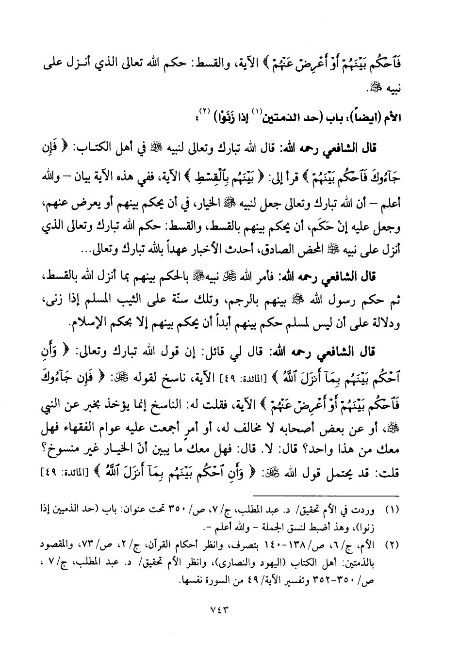 قال الشَّافِعِي رحمه الله: قال اللَّه تبارك وتعالى لنبيه - صلى الله عليه وسلم - في أهل الكتاب: (فَإِنْ جَاءُوكَ فَاحْكُمْ بَيْنَهُمْ) قرأ إلى: (بَيْنَهُمْ بِالْقِسْطِ) الآية، ففي هذه الآية بيان - واللَّه أعلم - أن اللَّه تبارك وتعالى جعل لنبيه - صلى الله عليه وسلم - الخيار، في أن يحكم بينهم أو يعرض عنهم.