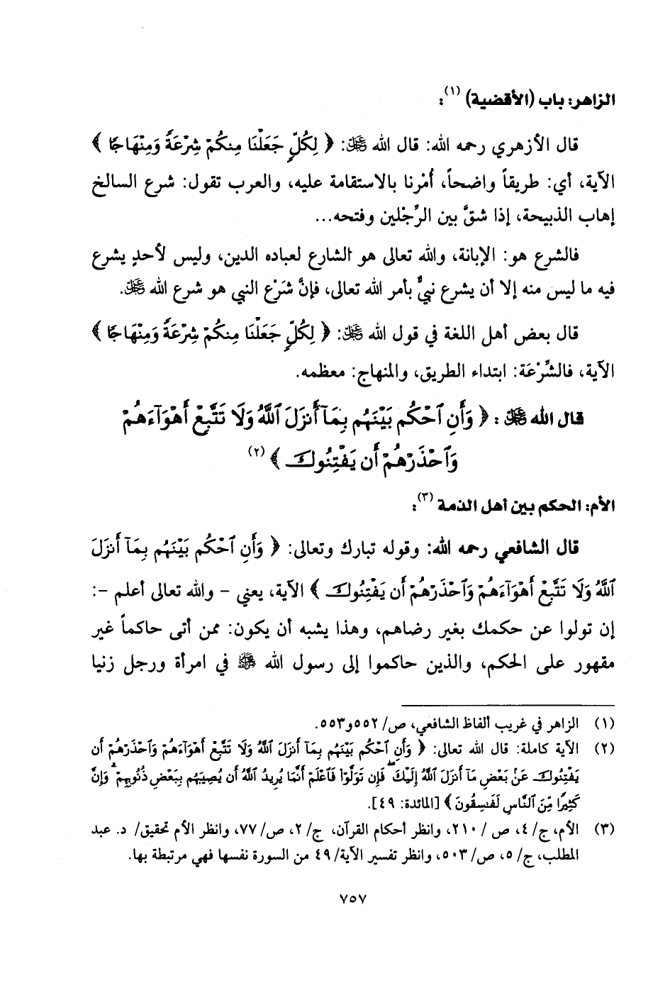 قال الشَّافِعِي رحمه الله: وقوله تبارك وتعالى: (وَأَنِ احْكُمْ بَيْنَهُمْ بِمَا أَنْزَلَ اللَّهُ وَلَا تَتَّبِعْ أَهْوَاءَهُمْ وَاحْذَرْهُمْ أَنْ يَفْتِنُوكَ) الآية.