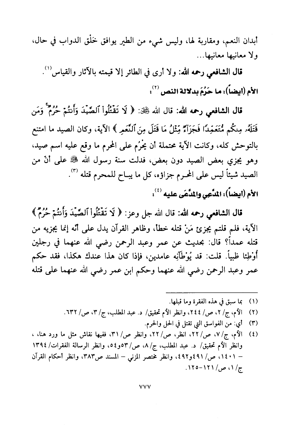 قال الشَّافِعِي رحمه الله: قال اللَّه جل وعز: (لَا تَقْتُلُوا الصَّيْدَ وَأَنْتُمْ حُرُمٌ)