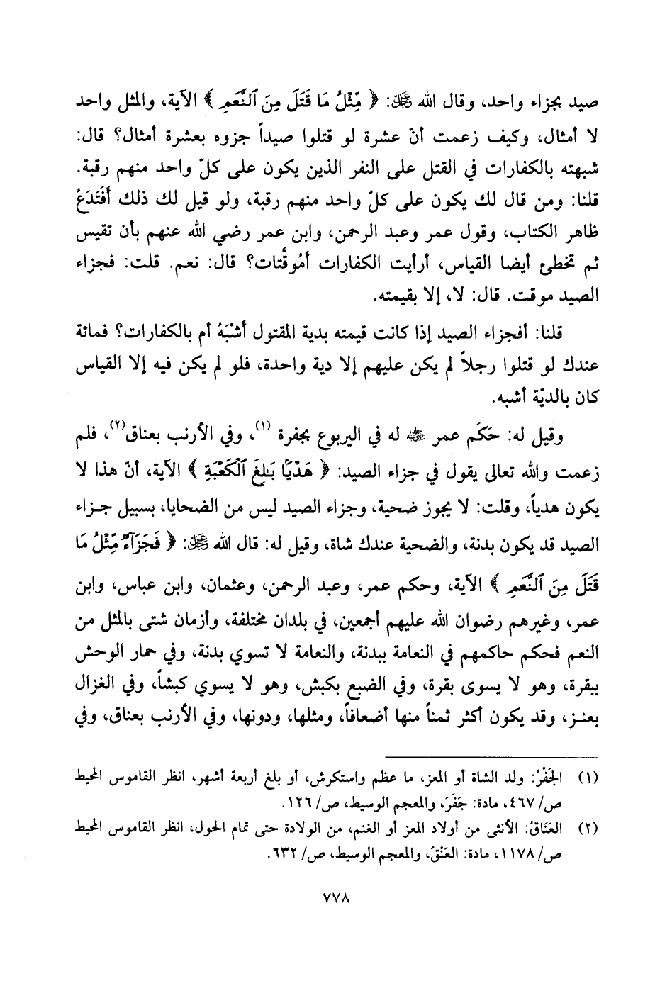 عمر، وغيرهم رضوان اللَّه عليهم أجمعين، في بلدان مختلفة، وأزمان شتى بالمثل من النعم فحكم حاكمهم في النعامة ببدنة، والنعامة لا تسوي بدنة، وفي حمار الوحش ببقرة، وهو لا يسوى بقرة، وفي الضبع بكبش، وهو لا يسوي كبشاً، وفي الغزال بعنز، وقد يكون أكثر ثمناً منها أضعافاً، ومثلها، ودونها، وفي الأرنب بعناق، وفي