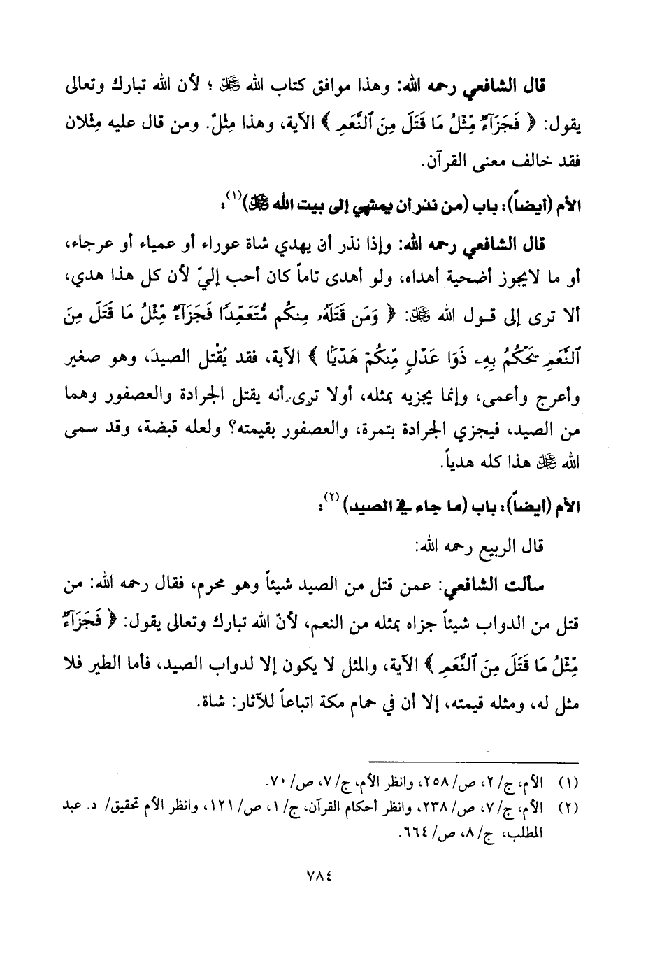 قال الشَّافِعِي رحمه الله: وهذا موافق كتاب الله - عزَّ وجلَّ، لأن الله تبارك وتعالى يقول: (فَجَزَاءٌ مِثْلُ مَا قَتَلَ مِنَ النَّعَمِ) الآية، وهذا مِثلٌ.