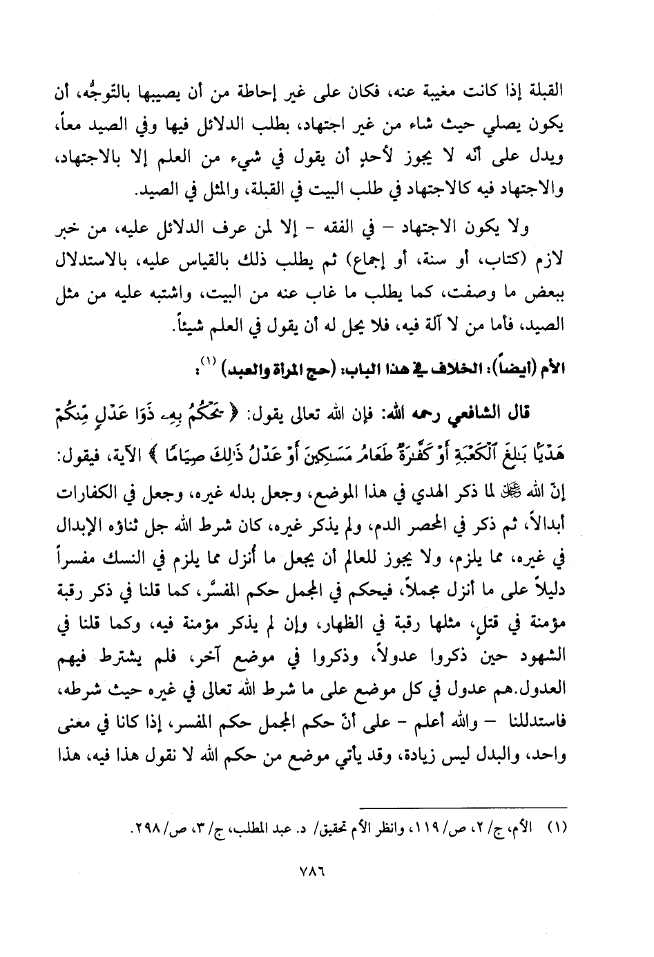 قال الشَّافِعِي رحمه الله: فإن الله تعالى يقول: (يَحْكُمُ بِهِ ذَوَا عَدْلٍ مِنْكُمْ هَدْيًا بَالِغَ الْكَعْبَةِ أَوْ كَفَّارَةٌ طَعَامُ مَسَاكِينَ أَوْ عَدْلُ ذَلِكَ صِيَامًاا) الآية.