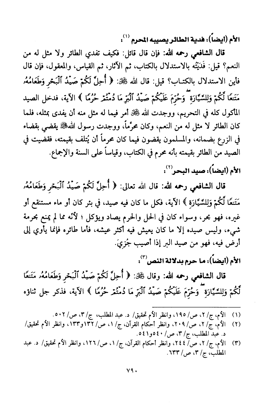 قال الشَّافِعِي رحمه الله: وقال عزَّ وجلَّ: (أُحِلَّ لَكُمْ صَيْدُ الْبَحْرِ وَطَعَامُهُ مَتَاعًا لَكُمْ وَلِلسَّيَّارَةِ وَحُرِّمَ عَلَيْكُمْ صَيْدُ الْبَرِّ مَا دُمْتُمْ حُرُمًا) الآية.