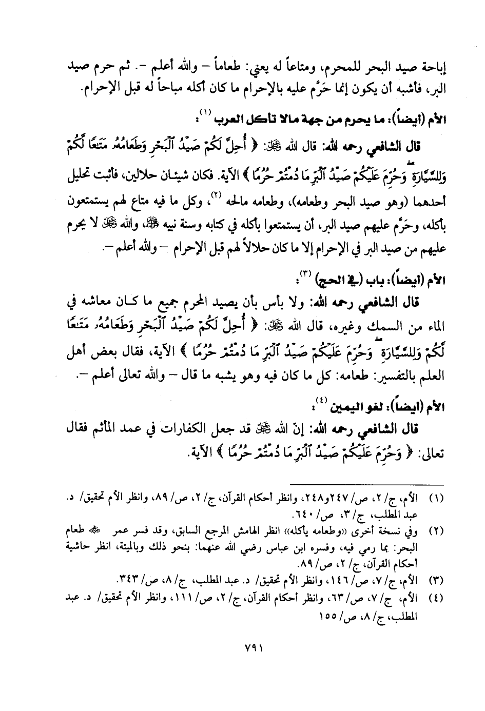 قال الشَّافِعِي - رحمه الله -: قال الله عزَّ وجلَّ: (أُحِلَّ لَكُمْ صَيْدُ الْبَحْرِ وَطَعَامُهُ مَتَاعًا لَكُمْ وَلِلسَّيَّارَةِ وَحُرِّمَ عَلَيْكُمْ صَيْدُ الْبَرِّ مَا دُمْتُمْ حُرُمًا) الآية.