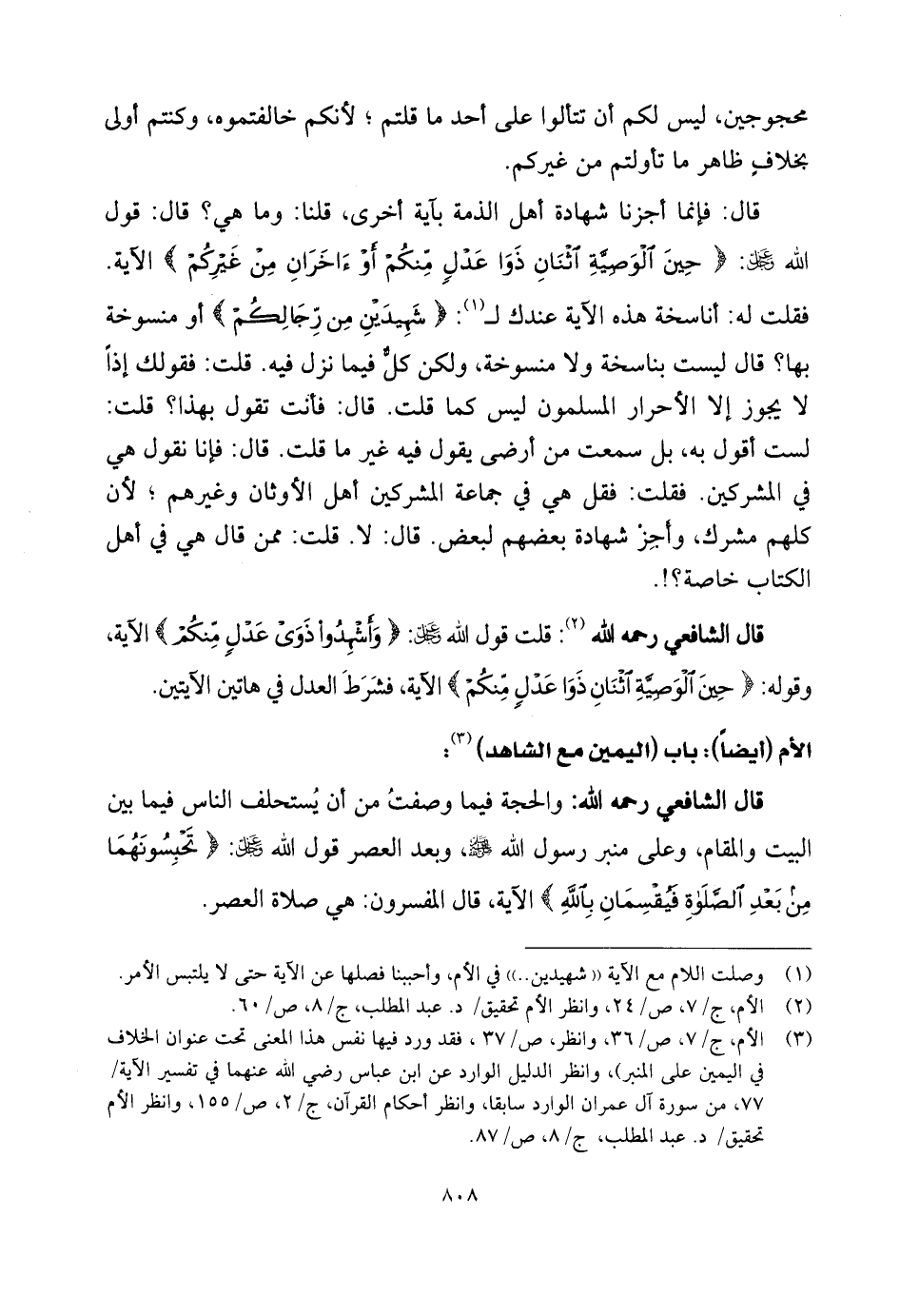 قال الشَّافِعِي رحمه الله: قلت قول الله - عزَّ وجلَّ: (وَأَشْهِدُوا ذَوَيْ عَدْلٍ مِنْكُمْ) الآية.