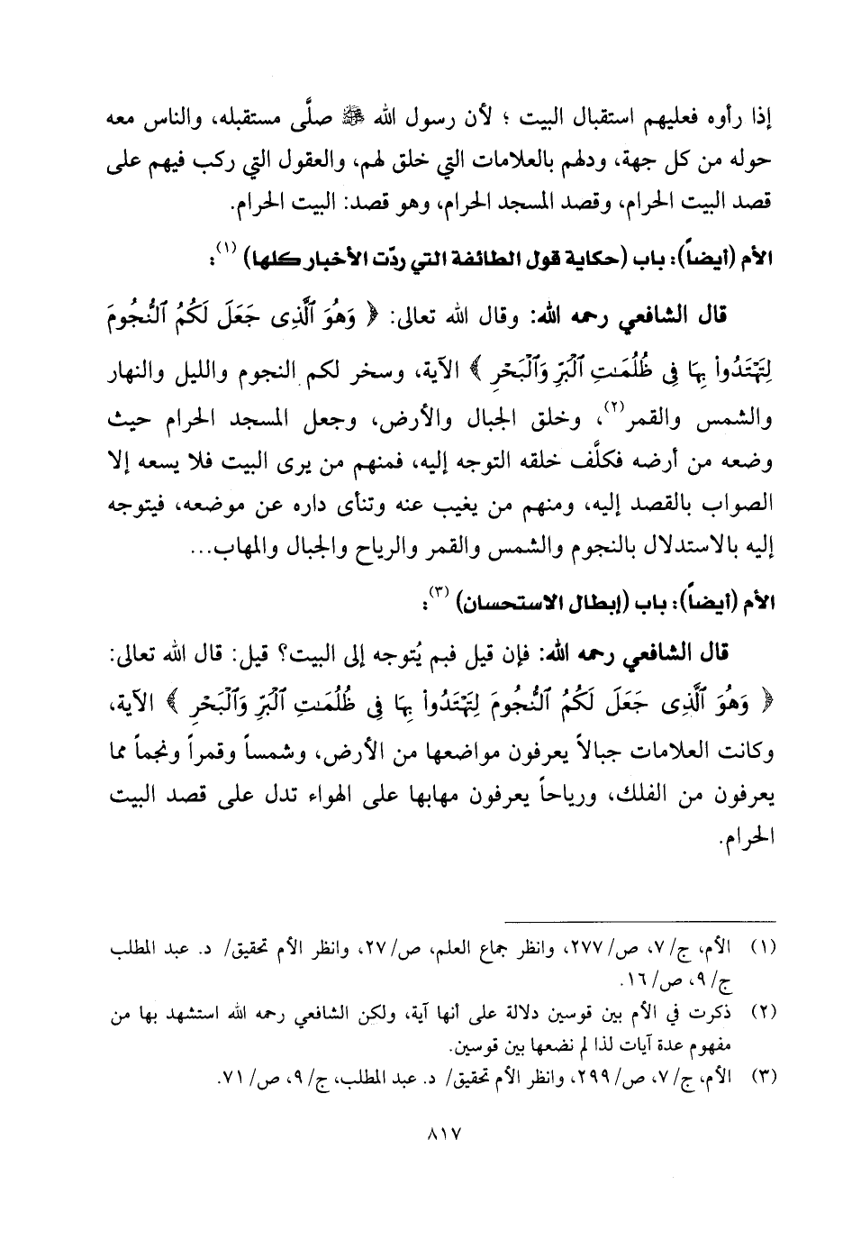 قال الشَّافِعِي رحمه الله: وقال اللَّه تعالى: (وَهُوَ الَّذِي جَعَلَ لَكُمُ النُّجُومَ لِتَهْتَدُوا بِهَا فِي ظُلُمَاتِ الْبَرِّ وَالْبَحْرِ) الآية.