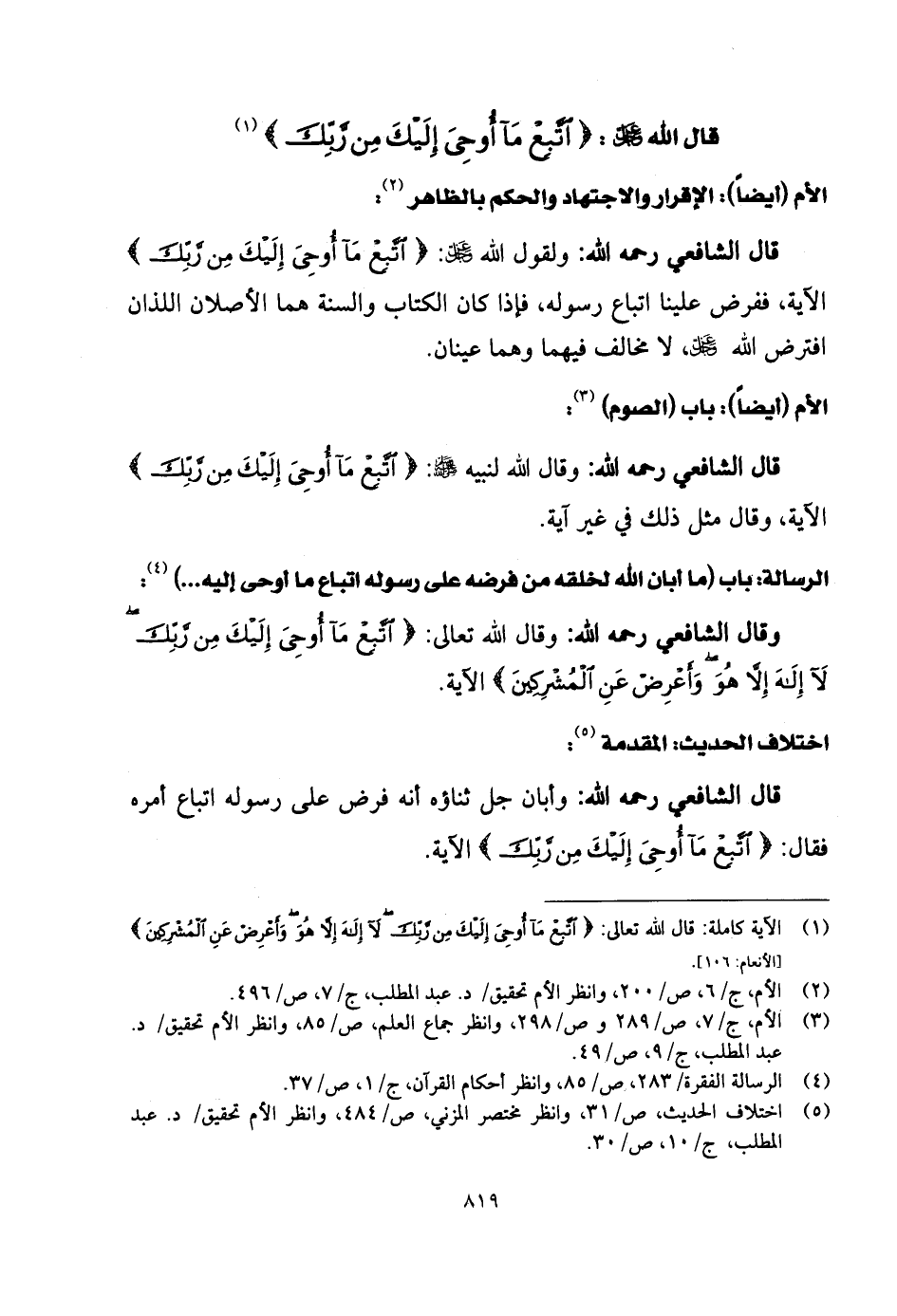 قال الشَّافِعِي رحمه الله: ولقول الله عزَّ وجلَّ: (اتَّبِعْ مَا أُوحِيَ إِلَيْكَ مِنْ رَبِّكَ)