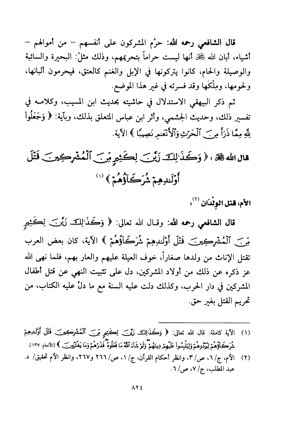 قال الشَّافِعِي رحمه الله: وقال اللَّه تعالى: (وَكَذَلِكَ زَيَّنَ لِكَثِيرٍ مِنَ الْمُشْرِكِينَ قَتْلَ أَوْلَادِهِمْ شُرَكَاؤُهُمْ) الآية.