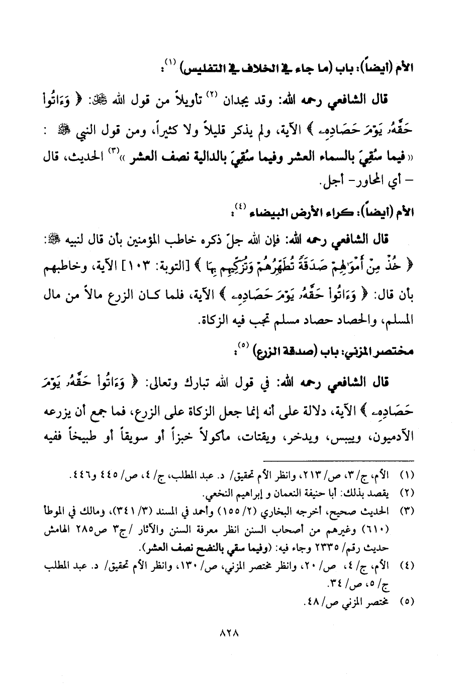 قال الشَّافِعِي رحمه الله: وقد يجدان تأويلاً من قول اللَّه - عز وجل -: (وَآتُوا حَقَّهُ يَوْمَ حَصَادِهِ) الآية، ولم يذكر قليلاً ولا كثيراً.