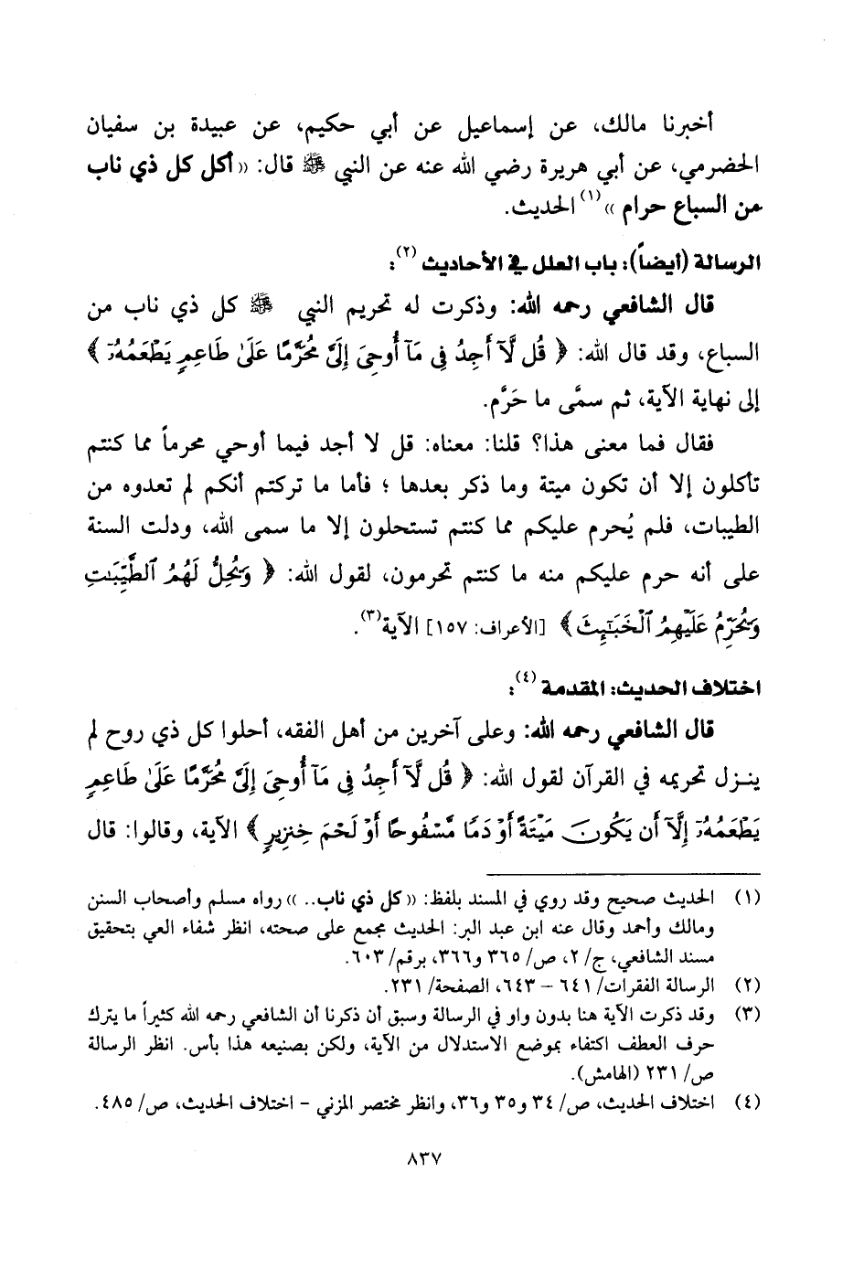 قال الشَّافِعِي رحمه الله: وذكرت له تحريم النبي - صلى الله عليه وسلم - كل ذي ناب من السباع، وقد قال اللَّه: (قُلْ لَا أَجِدُ فِي مَا أُوحِيَ إِلَيَّ مُحَرَّمًا عَلَى طَاعِمٍ يَطْعَمُهُ) إلى نهاية الآية، ثم سمى ما حَرَّم.