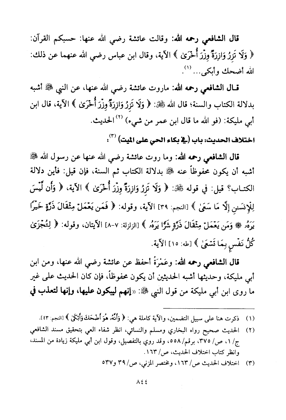 قال الشَّافِعِي رحمه الله: وقالت عائشة رضي اللَّه عنها: حسبكم القرآن: