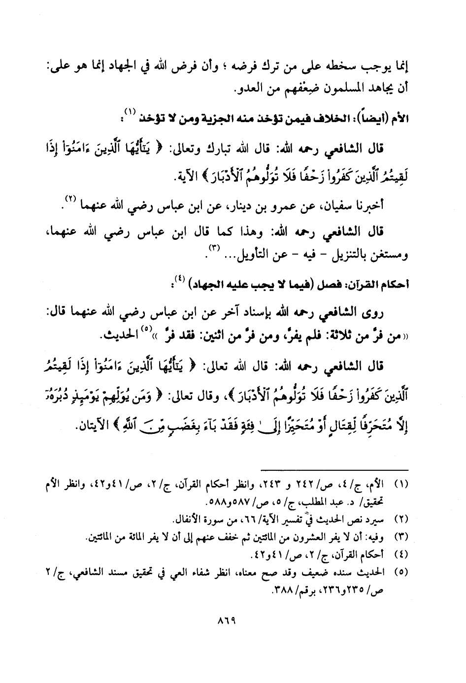 قال الشَّافِعِي رحمه الله: قال الله تبارك وتعالى: (يَا أَيُّهَا الَّذِينَ آمَنُوا إِذَا لَقِيتُمُ الَّذِينَ كَفَرُوا زَحْفًا فَلَا تُوَلُّوهُمُ الْأَدْبَارَ) .