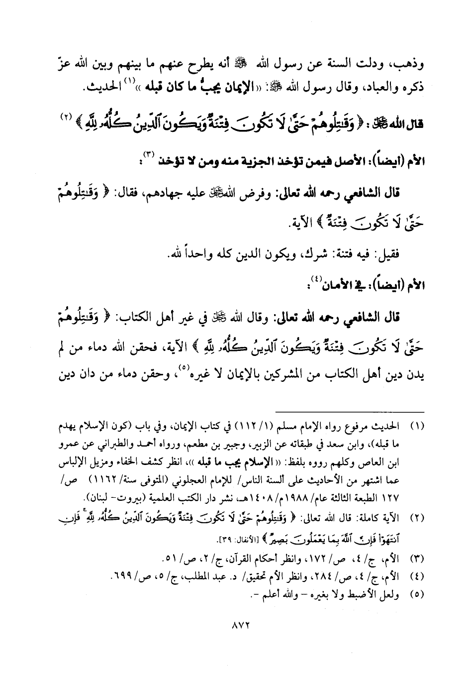 قال الشَّافِعِي رحمه الله تعالى: وقال اللَّه - عز وجل - في غير أهل الكتاب: (وَقَاتِلُوهُمْ حَتَّى لَا تَكُونَ فِتْنَةٌ وَيَكُونَ الدِّينُ كُلُّهُ لِلَّهِ) الآية.