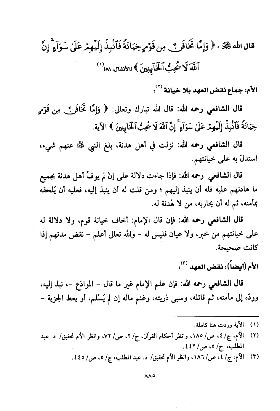 قال الشَّافِعِي رحمه الله: قال الله تبارك وتعالى: (وَإِمَّا تَخَافَنَّ مِنْ قَوْمٍ خِيَانَةً فَانْبِذْ إِلَيْهِمْ عَلَى سَوَاءٍ إِنَّ اللَّهَ لَا يُحِبُّ الْخَائِنِينَ) .