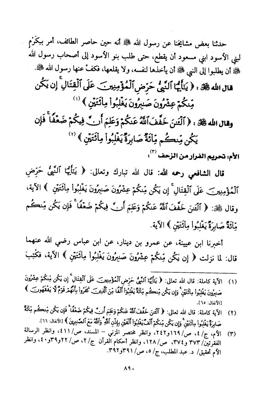 قال الشَّافِعِي رحمه الله: قال اللَّه تبارك وتعالى: (يَا أَيُّهَا النَّبِيُّ حَرِّضِ الْمُؤْمِنِينَ عَلَى الْقِتَالِ إِنْ يَكُنْ مِنْكُمْ عِشْرُونَ صَابِرُونَ يَغْلِبُوا مِائَتَيْنِ) الآية.