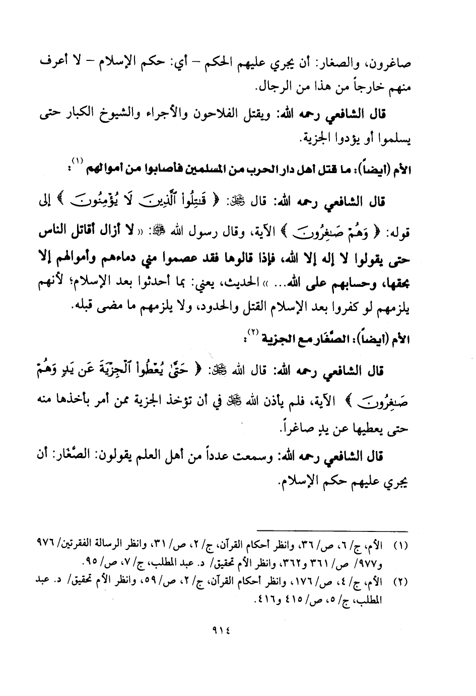 قال الشَّافِعِي رحمه الله: قال - عز وجل -: (قَاتِلُوا الَّذِينَ لَا يُؤْمِنُونَ بِاللَّهِ وَلَا بِالْيَوْمِ الْآخِرِ وَلَا يُحَرِّمُونَ مَا حَرَّمَ اللَّهُ وَرَسُولُهُ وَلَا يَدِينُونَ دِينَ الْحَقِّ مِنَ الَّذِينَ أُوتُوا الْكِتَابَ حَتَّى يُعْطُوا الْجِزْيَةَ عَنْ يَدٍ وَهُمْ صَاغِرُونَ) .
