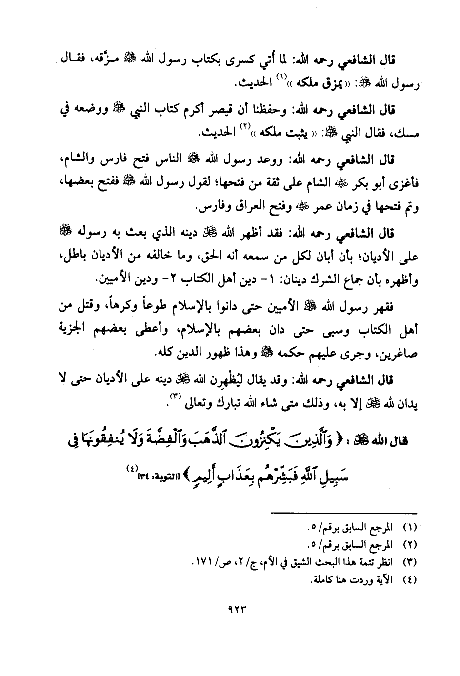 قال الشَّافِعِي رحمه الله: لما أتي كسرى بكتاب رسول الله - صلى الله عليه وسلم - مزَّقه، فقال رسول الله - صلى الله عليه وسلم -: " يمزق ملكه" الحديث.