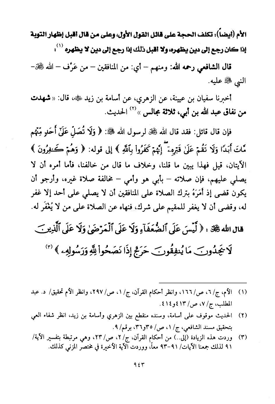 فإن قال قائل: فقد قال الله - عزَّ وجلَّ لرسول اللَّه - صلى الله عليه وسلم -: (وَلَا تُصَلِّ عَلَى أَحَدٍ مِنْهُمْ مَاتَ أَبَدًا وَلَا تَقُمْ عَلَى قَبْرِهِ إِنَّهُمْ كَفَرُوا بِاللَّهِ وَرَسُولِهِ) إلى قوله: (وَهُمْ كَافِرُونَ) الآيتان.