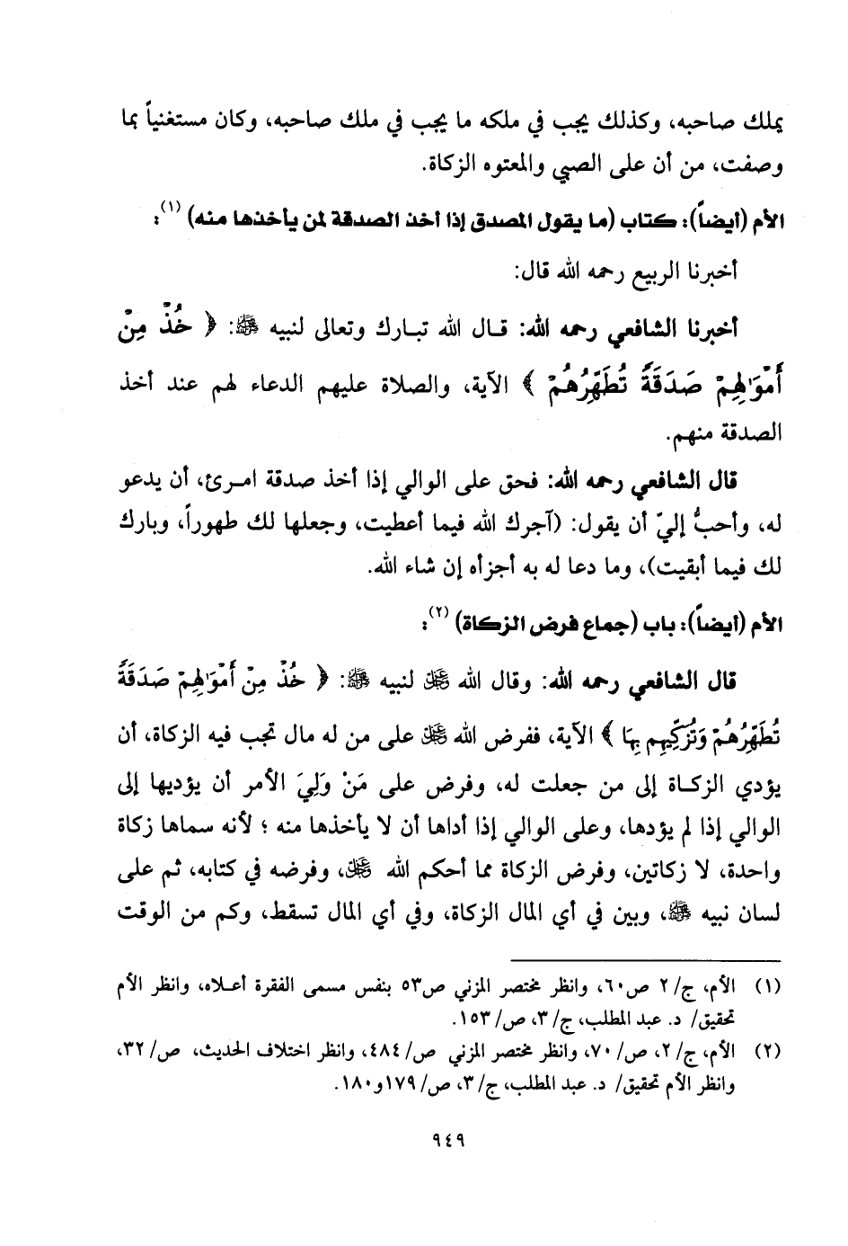 قال الشَّافِعِي رحمه الله: وقال اللَّه - عز وجل - لنبيه - صلى الله عليه وسلم -: (خُذْ مِنْ أَمْوَالِهِمْ صَدَقَةً تُطَهِّرُهُمْ وَتُزَكِّيهِمْ بِهَا) الآية.