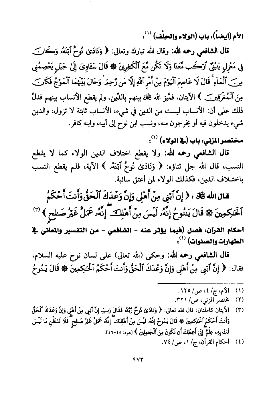 قال الشَّافِعِي - رحمه الله -: وقال اللَّه تبارك وتعالى: (وَنَادَى نُوحٌ ابْنَهُ وَكَانَ فِي مَعْزِلٍ يَا بُنَيَّ ارْكَبْ مَعَنَا وَلَا تَكُنْ مَعَ الْكَافِرِينَ (42) قَالَ سَآوِي إِلَى جَبَلٍ يَعْصِمُنِي مِنَ الْمَاءِ قَالَ لَا عَاصِمَ الْيَوْمَ مِنْ أَمْرِ اللَّهِ إِلَّا مَنْ رَحِمَ وَحَالَ بَيْنَهُمَا الْمَوْجُ فَكَانَ مِنَ الْمُغْرَقِينَ (43)